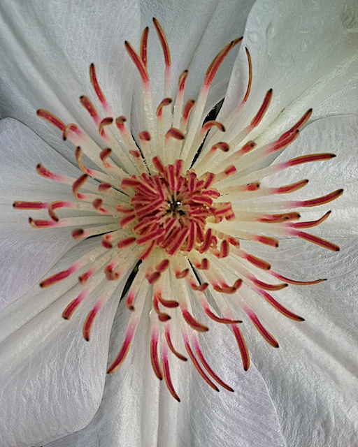 Regardless, both Nelly Moser and Henrii are fairly common varieties and are regarded as excellent repeat bloomers, each with a relatively long flowering season. Although, I remember not being overly impressed with either variety when I was first familiar with clematis, (candy cane pink = too cute; white = boring), I’ve come around over the years. Because of their easy maintenance, excellent hardiness, great repeat blooming, potential for sizable blooms (Nelly Moser, up to 9 inches; Henrii up to 7 inches ) as well as prolific blooming – I’ve had these varieties absolutely smothered with flowers, even when I’ve totally neglected them –  each has grown to become an all-time favorite of mine. Best of all, I adore roses, and clematis make perfect rose companions.