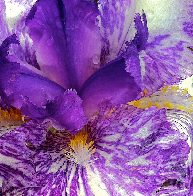 Award winning Iris germanica “Batik” is a dramatic, and I daresay, show-stopping garden plant that blooms Spring and Summer. Such a Drama Queen! I can’t imagine my garden without several of these flashy sword-leaved beauties featuring royal-purple flowers with random spatters and streaks of white on its standards and falls. In fact, I plan to add more to my garden each year.