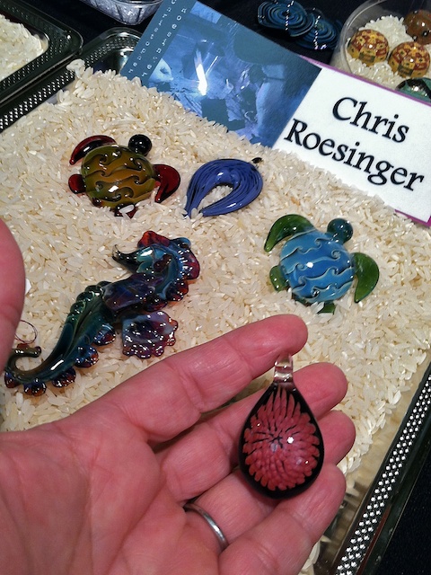 When I first walked into the bead show, one thing was obvious: a bead may be made from just about anything. Historically, the first beads were made from seeds. And there were seed beads at this show.  But also, there were beads crafted from minerals, metals, paper, acrylic, glass, clay, polymer, rubber, plastic, and more. There were decoupaged beads, sliced-stone beads, and glass-blown beads. Overall, my favorites were the lamp glass beads.