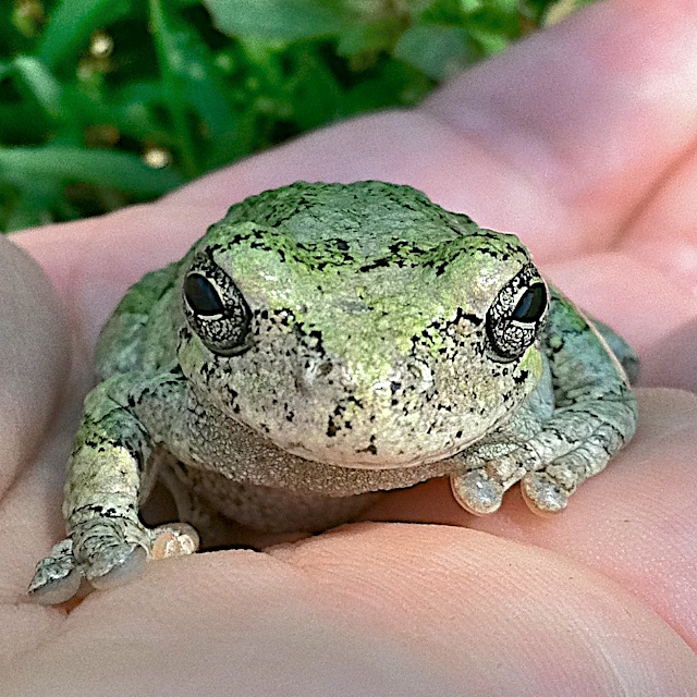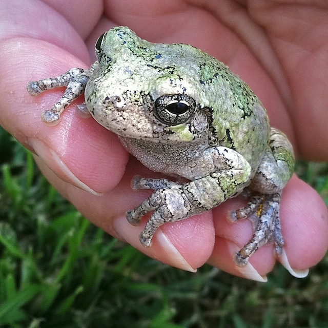 Two days ago, the lifeguard at our local pool rescued a frog from the pool skimmer. Based solely on looks, I have unscientifically identified the little darling (the frog, not the lifeguard) as one of two Gray Treefrog species native to Virginia. According to the Virginia Herpetological Society, the way to distinguish the Gray Treefrog, Hyla versicolor, from the very similar-looking Copes Gray Treefrog, Hyla chrysoscelis, is by their found location and their different calls. My friend was silent, so, because of our location in the state, I’m going with Hyla versicolor.