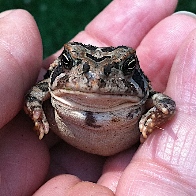 Photo note: I tried, tried, tried, to achieve a photo with Buddha Toad’s nose in the same focal plane as the rest of his body… however, my trusty iPhone camera was not so trusty on that day; Buddha Toad’s nose remains out of focus in a photo or two. But then, I figured his personality transcends all technical issues… so I’ve published anyway. I promise to find another It-Factor amphibian and try again!