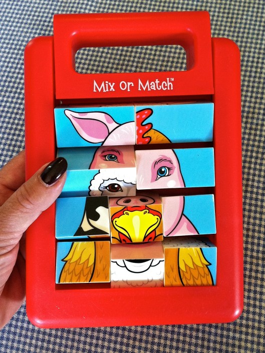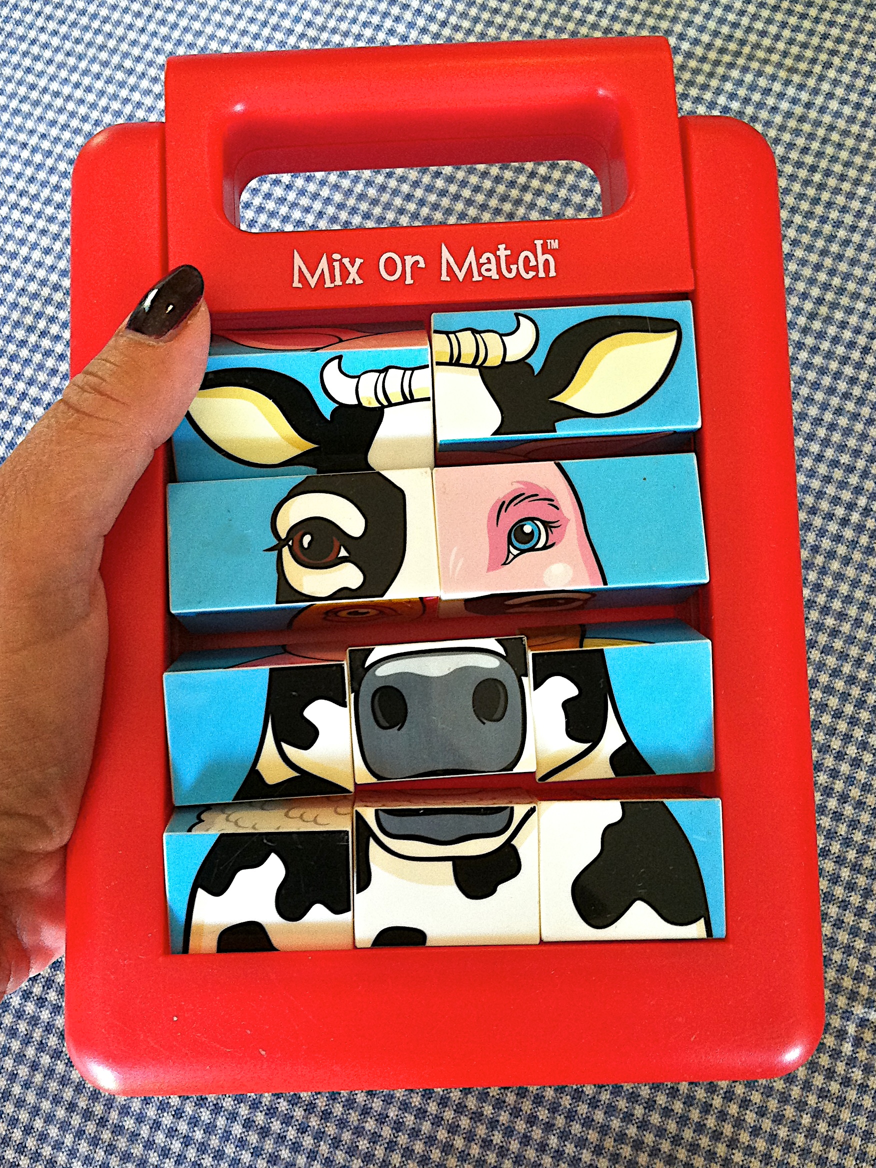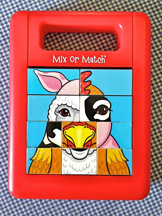 Last night, my husband’s grandson stayed over. Although granddaddy’s favorite little pre-schooler seems to have come from the womb totally obsessed with trucks, tractors and earth-moving equipment (both real and toy versions), last night we found him completely bewitched by the “Mix or Match” puzzle that he’d unearthed in the toy box.